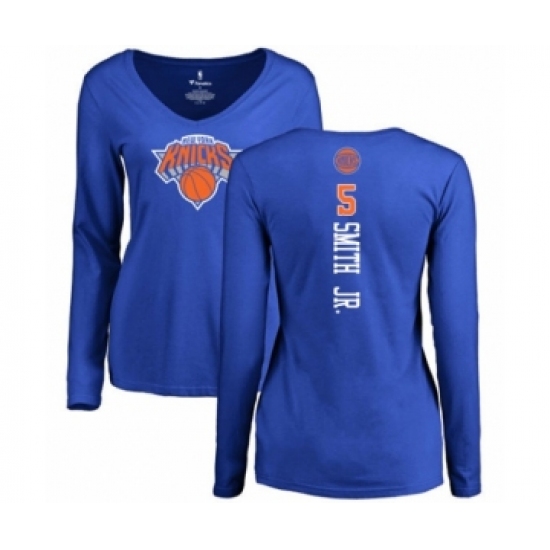 >Basketball Women's New York Knicks #5 Dennis Smith Jr. Royal Blue Backer Long Sleeve T-Shirt