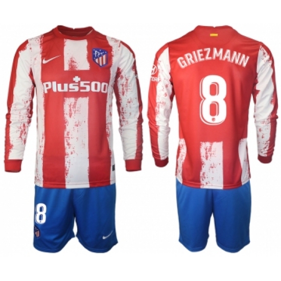 >Men 2021-2022 Club Atletico Madrid home red Long Sleeve 8 Soccer Jersey