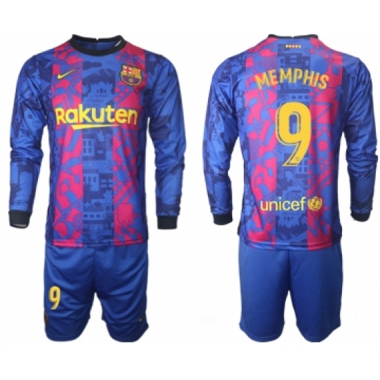 >Men 2021-2022 Club Barcelona Second away blue Long Sleeve 9 Soccer Jerseys
