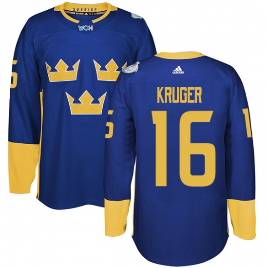 Men's Adidas Team Sweden #16 Marcus Kruger Premier Royal Blue Away 2016 World Cup of Hockey Jersey