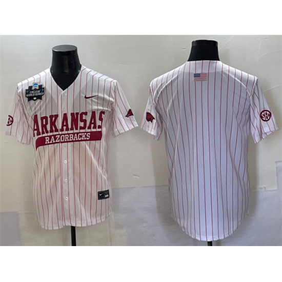 Men's Arkansas Razorbacks Blank White Pinstripe 2025 World Series & SEC Patch Stitched Jersey