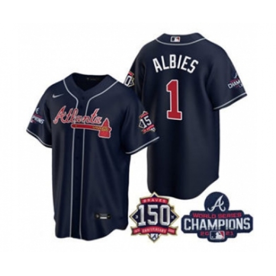 >Men's Atlanta Braves #1 Ozzie Albies 2021 Navy World Series Champions With 150th Anniversary Patch Cool Base Stitched Jersey