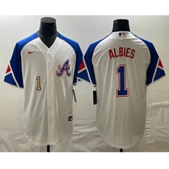 >Mens Atlanta Braves #1 Ozzie Albies Number White 2023 City Connect Cool Base Stitched Jersey