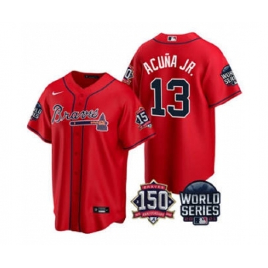 Men's Atlanta Braves #13 Ronald Acuna Jr. 2021 Red World Series With 150th Anniversary Patch Cool Base Baseball Jersey