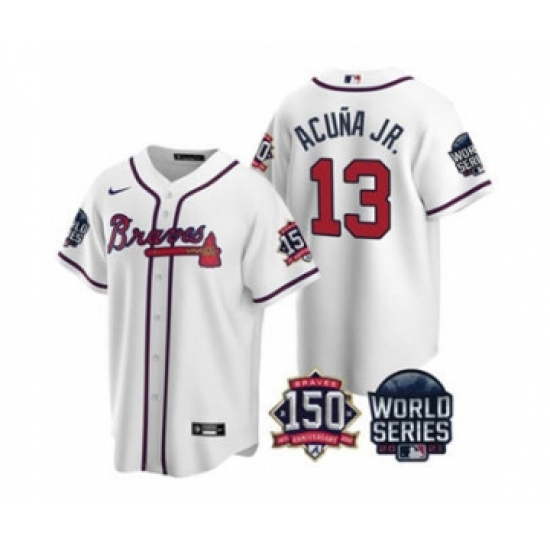 Men's Atlanta Braves #13 Ronald Acuna Jr. 2021 White World Series With 150th Anniversary Patch Cool Base Baseball Jersey