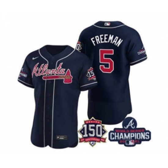 Men's Atlanta Braves #5 Freddie Freeman 2021 Navy World Series Champions With 150th Anniversary Flex Base Stitched Jersey