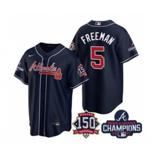 Men's Atlanta Braves #5 Freddie Freeman 2021 Navy World Series Champions With 150th Anniversary Patch Cool Base Stitched Jersey