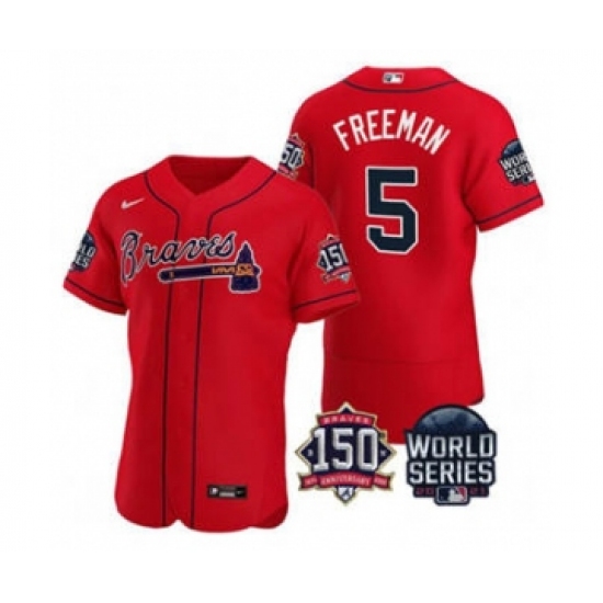 Men's Atlanta Braves #5 Freddie Freeman 2021 Red World Series Flex Base With 150th Anniversary Patch Baseball Jersey