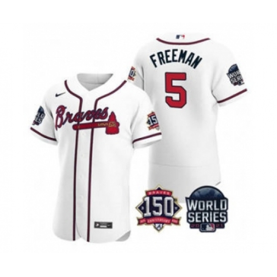 Men's Atlanta Braves #5 Freddie Freeman 2021 White World Series Flex Base With 150th Anniversary Patch Baseball Jersey
