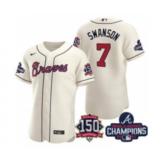 Men's Atlanta Braves #7 Dansby Swanson 2021 Cream World Series Champions With 150th Anniversary Flex Base Stitched Jersey