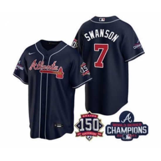 >Men's Atlanta Braves #7 Dansby Swanson 2021 Navy World Series Champions With 150th Anniversary Patch Cool Base Stitched Jersey