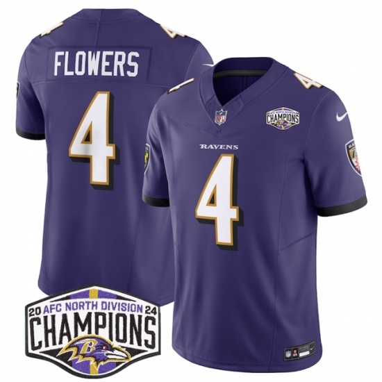 >Men's Baltimore Ravens #4 Zay Flowers Purple F.U.S.E 2024 AFC North Division Champions Vapor Limited Football Jersey