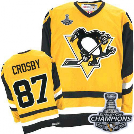 Men's CCM Pittsburgh Penguins #87 Sidney Crosby Premier Yellow Throwback 2017 Stanley Cup Champions NHL Jersey