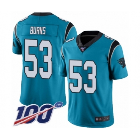 >Men's Carolina Panthers #53 Brian Burns Limited Blue Rush Vapor Untouchable 100th Season Football Jersey
