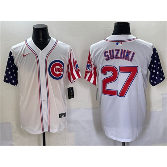 >Men's Chicago Cubs #27 Seiya Suzuki White 2025 Independence Day Vapor Premier Limited Stitched Baseball Jersey