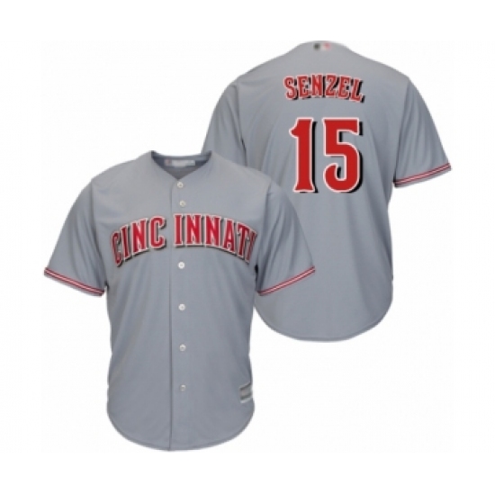 >Men's Cincinnati Reds #15 Nick Senzel Replica Grey Road Cool Base Baseball Jersey