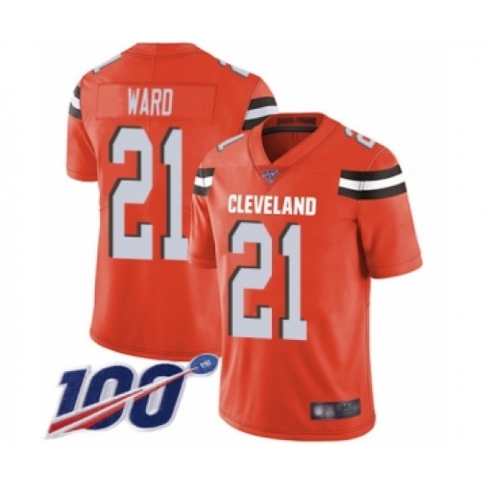 >Men's Cleveland Browns #21 Denzel Ward Orange Alternate Vapor Untouchable Limited Player 100th Season Football Jersey