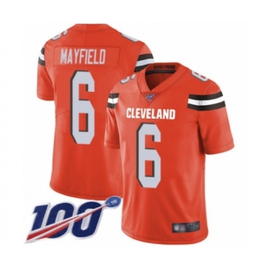 >Men's Cleveland Browns #6 Baker Mayfield Orange Alternate 100th Season Vapor Untouchable Limited Player Football Jersey