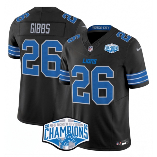 >Men's Detroit Lions #26 Jahmyr Gibbs Black 2024 NFC North Champions F.U.S.E. Vapor Limited Stitched Jersey
