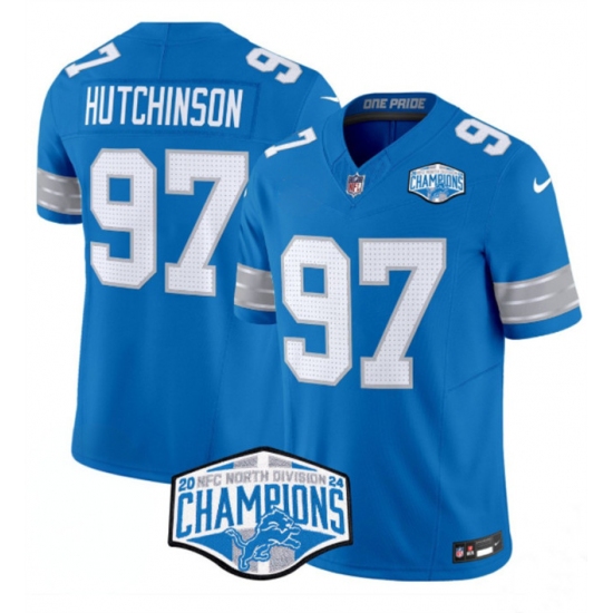 >Men's Detroit Lions #97 Aidan Hutchinson Blue 2024 NFC North Champions F.U.S.E. Vapor Limited Stitched Jersey