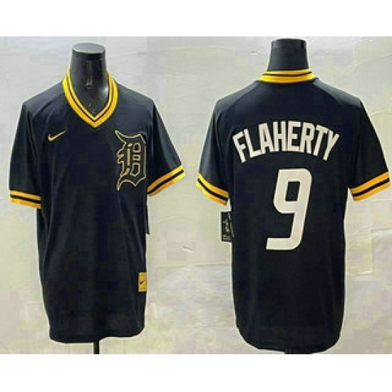 >Men's Detroit Tigers #9 Jack Flaherty Black Gold Nike Cooperstown Legend V Neck Jersey