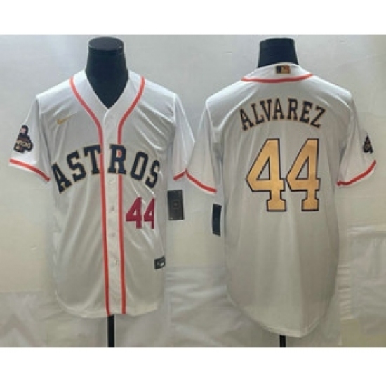 >Men's Houston Astros #44 Yordan Alvarez Number 2023 White Gold World Serise Champions Cool Base Stitched Jerseys