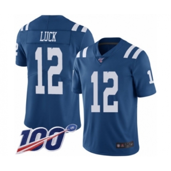 >Men's Indianapolis Colts #12 Andrew Luck Limited Royal Blue Rush Vapor Untouchable 100th Season Football Jersey