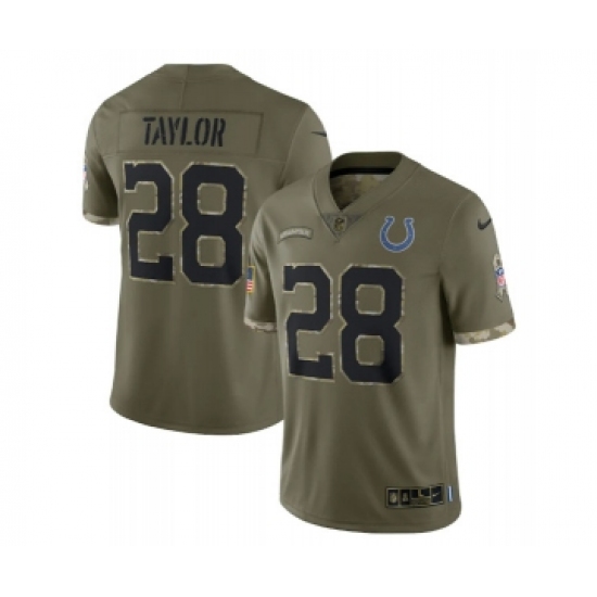 >Men's Indianapolis Colts #28 Jonathan Taylor 2022 Olive Salute To Service Limited Stitched Jersey