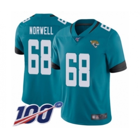 >Men's Jacksonville Jaguars #68 Andrew Norwell Teal Green Alternate Vapor Untouchable Limited Player 100th Season Football Jersey
