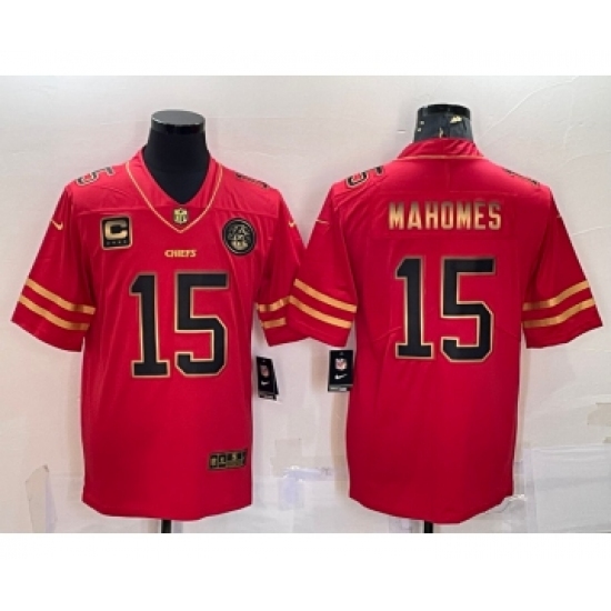 Men's Kansas City Chiefs #15 Patrick Mahomes Red Gold With C Patch Stitched Football Jersey