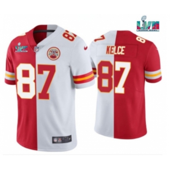 >Men’s Kansas City Chiefs #87 Travis Kelce Red & White Split Super Bowl LVII Patch Limited Stitched Jersey