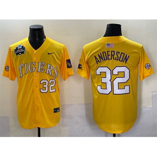 >Men's LSU Tigers #32 Kade Anderson Gold 2025 World Series & SEC Patch Stitched Baseball Jersey