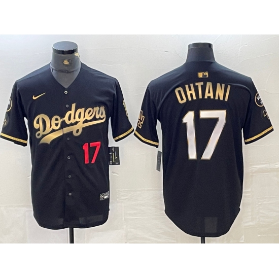 Mens Los Angeles Dodgers #17 Shohei Ohtani Number Black Gold Stitched Cool Base Nike Jersey