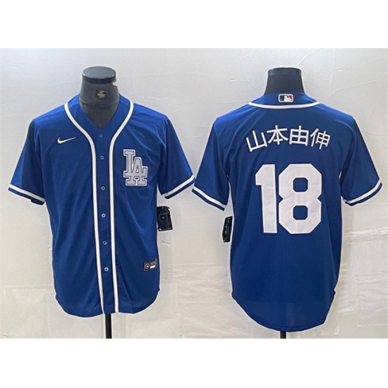 >Men's Los Angeles Dodgers #18 山本由伸 Blue Cool Base Stitched Baseball Jersey