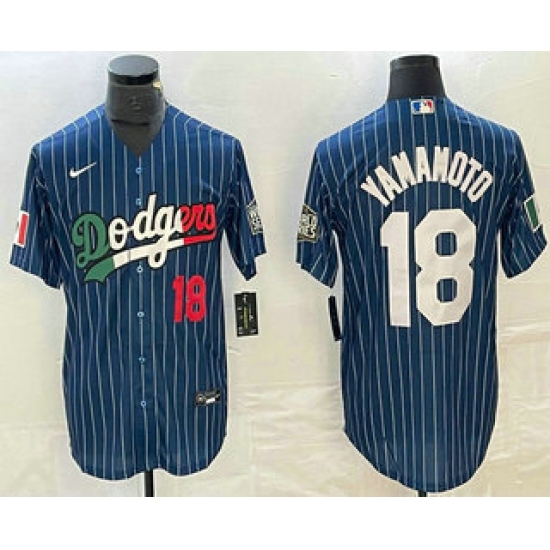 >Men's Los Angeles Dodgers #18 Yoshinobu Yamamoto Number Navy Blue Pinstripe Mexico 2020 World Series Cool Base Nike Jersey1