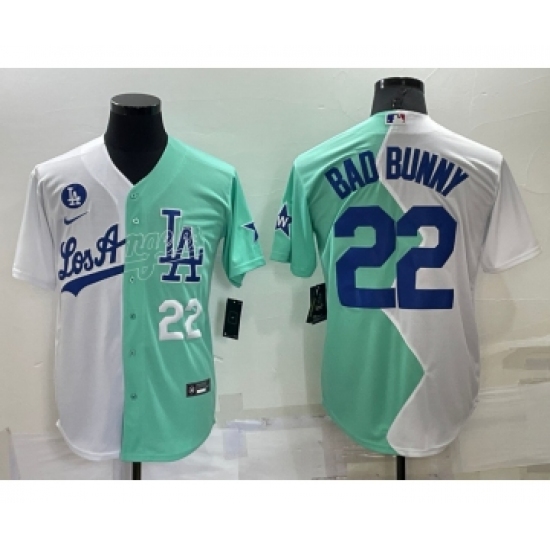 Men's Los Angeles Dodgers #22 Bad Bunny White Green Number 2022 Celebrity Softball Game Cool Base Jersey 1