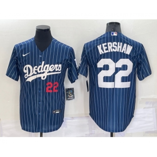 >Men's Los Angeles Dodgers #22 Clayton Kershaw Number Red Navy Blue Pinstripe Stitched MLB Cool Base Nike Jersey