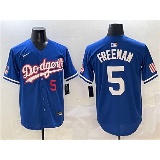 >Men's Los Angeles Dodgers #5 Freddie Freeman Royal With American Flag Limited Stitched Baseball Jersey