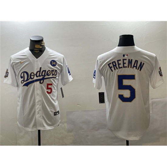 Men's Los Angeles Dodgers #5 Freddie Freeman White Gold 2024 World Series With No. 34 Home Limited Stitched Baseball Jersey