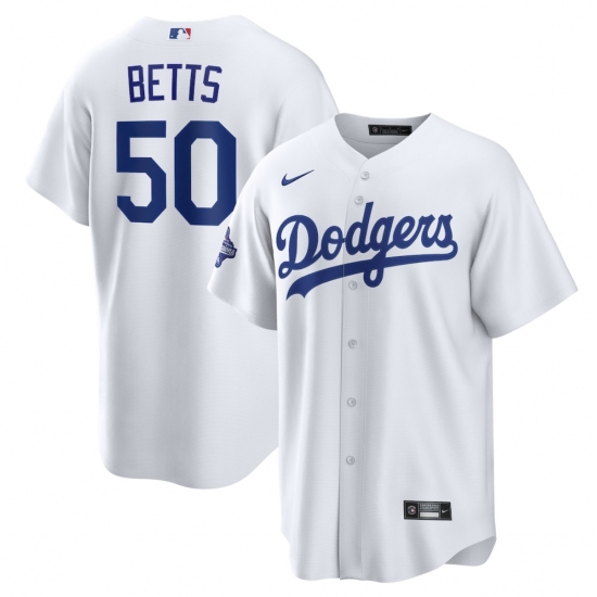 >Men's Los Angeles Dodgers #50 Mookie Betts White 2025 World Series Champions Home Cool Base Stitched Baseball Jersey