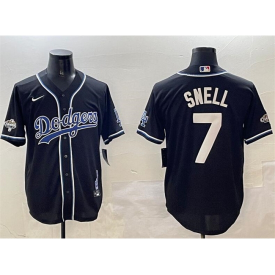 >Men's Los Angeles Dodgers #7 Blake Snell Black 2024 World Series Champions Cool Base Stitched Baseball Jersey