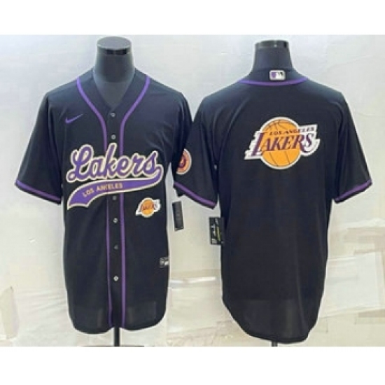 >Men's Los Angeles Lakers Black Team Big Logo With Cool Base Stitched Baseball Jersey