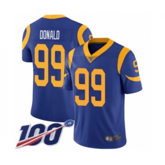 >Men's Los Angeles Rams #99 Aaron Donald Royal Blue Alternate Vapor Untouchable Limited Player 100th Season Football Jersey