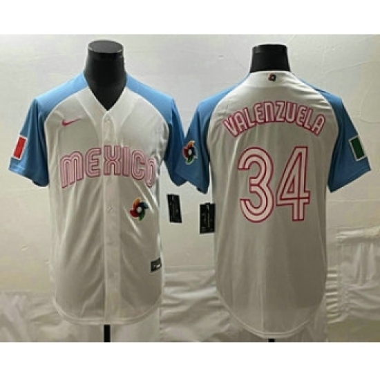 >Mens Mexico Baseball #34 Fernando Valenzuela 2023 White Blue World Classic Stitched Jersey