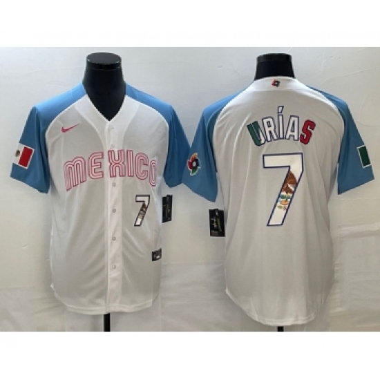 Men's Mexico Baseball #7 Julio Urías 2023 White Blue World Baseball Classic Stitched Jersey