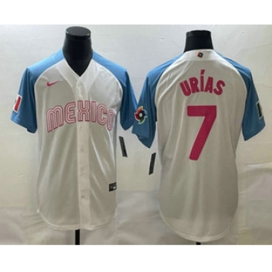 Men's Mexico Baseball #7 Julio Urias 2023 White Blue World Classic Stitched Jerseys