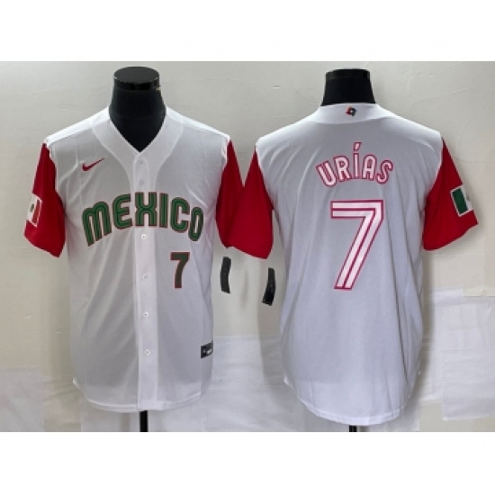 >Men's Mexico Baseball #7 Julio Urias Number 2023 White Red World Classic Stitched Jersey 40