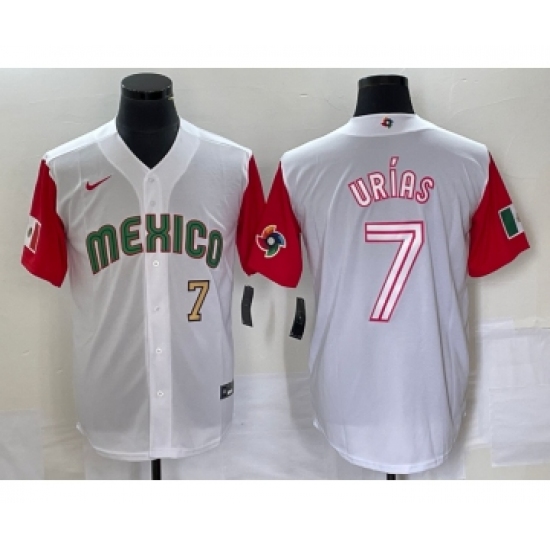 >Men's Mexico Baseball #7 Julio Urias Number 2023 White Red World Classic Stitched Jersey 43