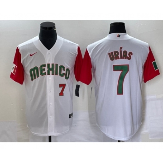 >Men's Mexico Baseball #7 Julio Urias Number 2023 White Red World Classic Stitched Jersey 51