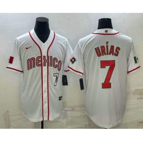 >Men's Mexico Baseball #7 Julio Urias Number 2023 White World Baseball Classic Stitched Jersey